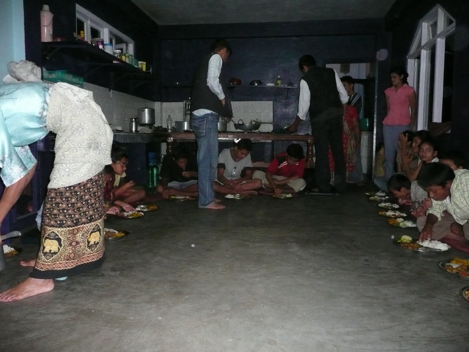Der var dækket op til festmiddag i køkkenet – da vi kom op sad alle langs væggen med deres metal tallerken foran sig klar til deres dahl bat, der i dagens anledning var peppet op med kød. Kød er nemlig forholdsmæssigt dyrt i Nepal. Vi spiste – som det mest naturlige – med fingrene hvilket gav os en masse respekt og gule carry negle. Faktisk er det ikke noget jeg længere tænker over. Maden smager ganske enkelt bedre, når den indtages med klør fem.
