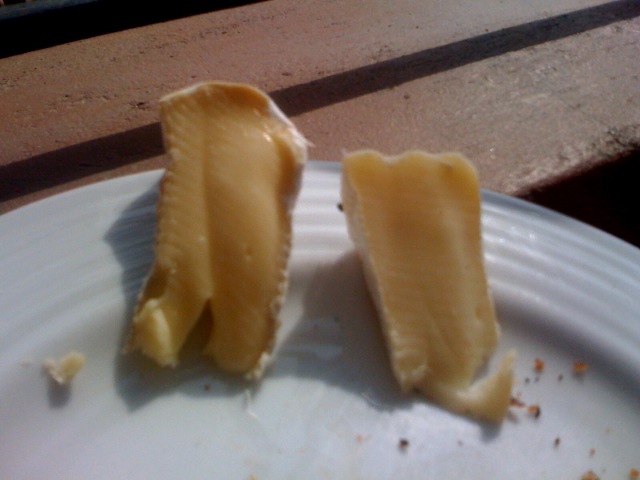 Stykket til venstre er Jindi Camembert fra Australien, der kun har ligget i varmen et par timer. Smagen er fuldstændigt forrygende – konsistensen lige så.