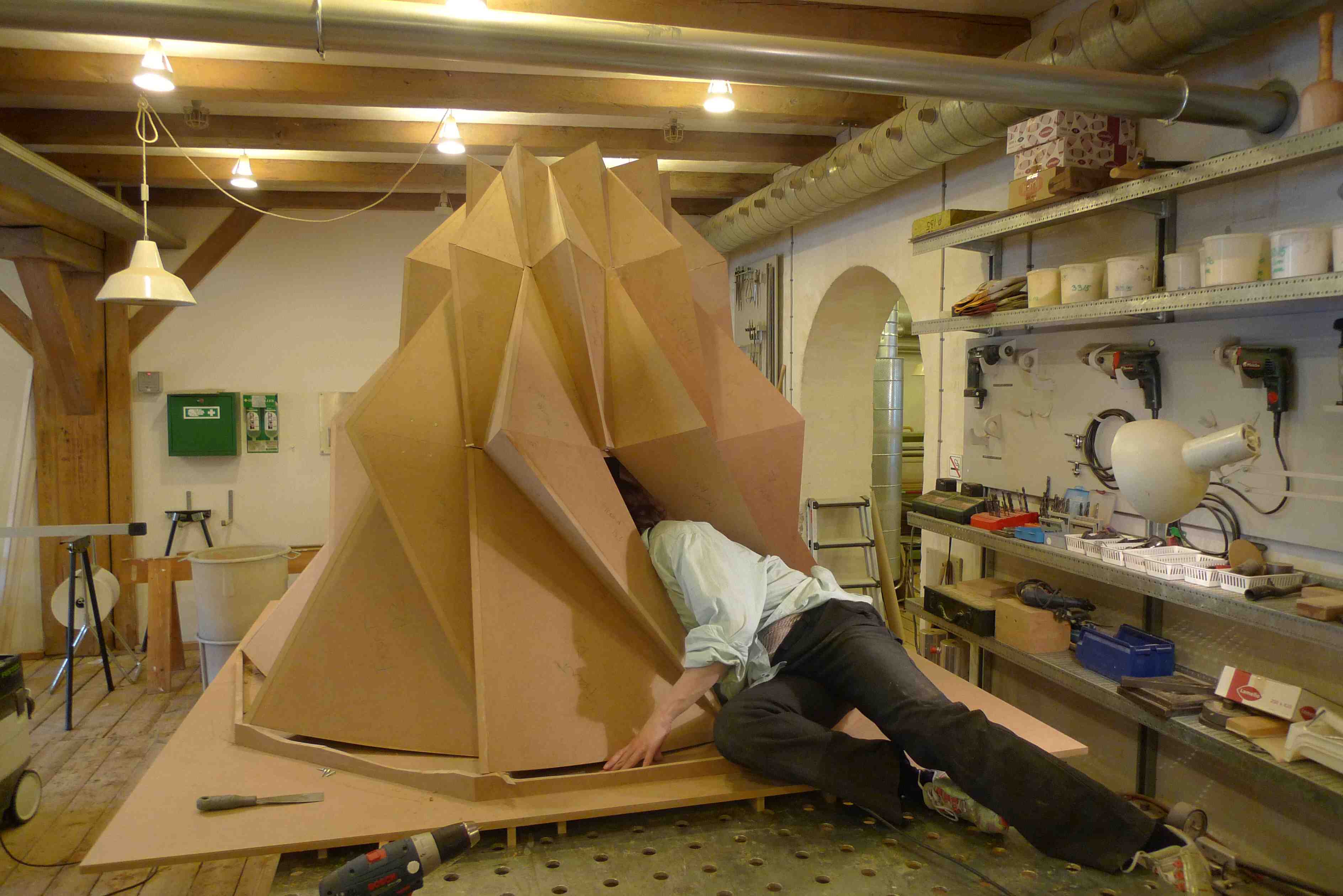 Hun sender nemlig samtidigt et billede fra hendes værksted hvor hun – som det fremgår af ovenfor – ligger vandret (hø, hø) for at få sin forrygende skulptur klar til indvigelsen. Frederiksberg – helt præcist Kjeld Petersens Plads – bliver ikke sig selv igen når Eva har sat sit fingeraftryk. Pladsen bliver nemlig en klasse for sig selv.