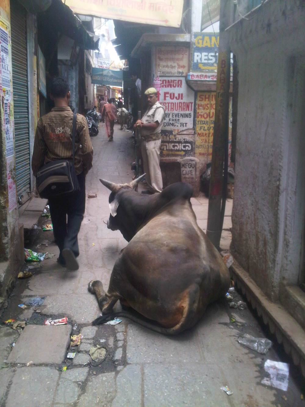 De mange nærende rester fra de mange religiøse optog der tilstadighed foregår her langs Ganges breder er naturligvis også forklaringen på hvorfor alle okserne generelt virker sundere her end i Kathmandu.
