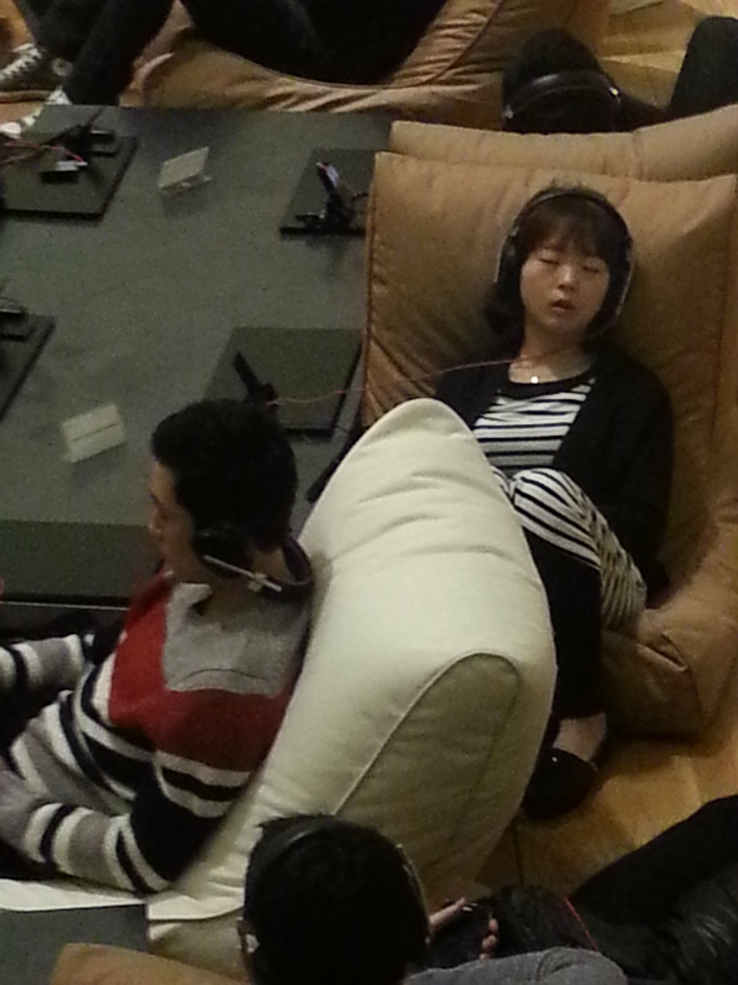 Efter lytterummet træder man ind i et kæmpe rum med fire etager til loftet med en facinerende og meget oplagt year by year collage med alle ECM’s udgivelser gennem fyrre år. Rummet virker en smule overskudsagtigt. For udover collagen er der intet andet end en masse kæmpe bean bags hvor publikun lå henslængt med head sets på og sov, spillede games på mobilen eller holdt hånd.